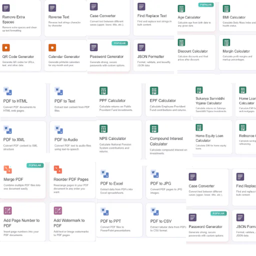 Work smarter with 115+ powerful online tools designed to make your daily digital tasks easier than ever. Whether you need to convert PDF files, compress images, merge documents, calculate results, or format text, this all-in-one toolkit has everything you need — completely free, fast, and secure.